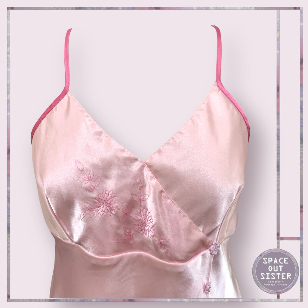 Embrace the ethereal charm of the Vintage Rose Pink Slip Dress, a sumptuous creation in luxurious satin, adorned with delicate floral embroidery that dances gracefully along the center panel.
