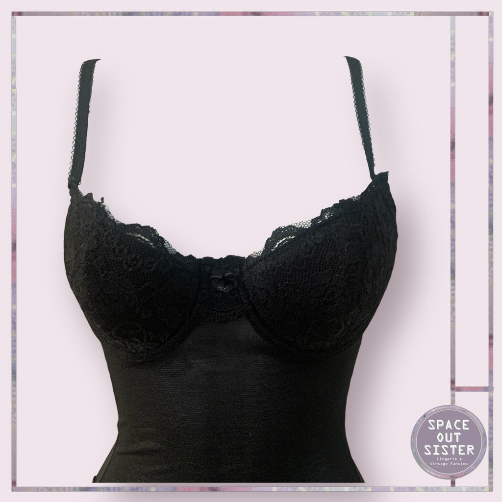 This Vintage Black Lace Teddy is a must-have for any lingerie collection. Featuring a delicate lace waist and hip, and a supportive underwire bust area, it exudes elegance and timeless charm.