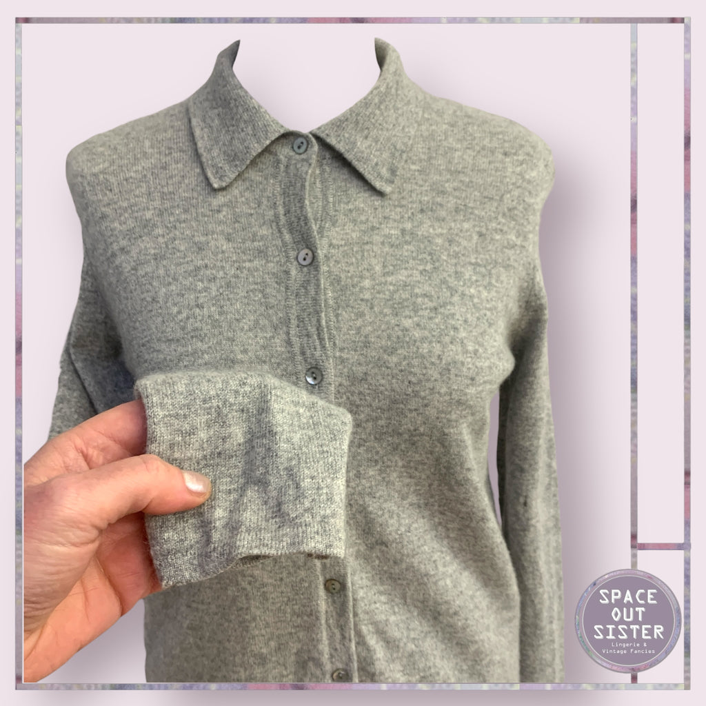 Expertly crafted and luxuriously soft, our Pre-Loved Precious Fibres Cashmere Cardigan is a must-have addition to any wardrobe. Made from beautiful grey cashmere, this cardigan offers timeless elegance and comfort. As seen, please see last photo.