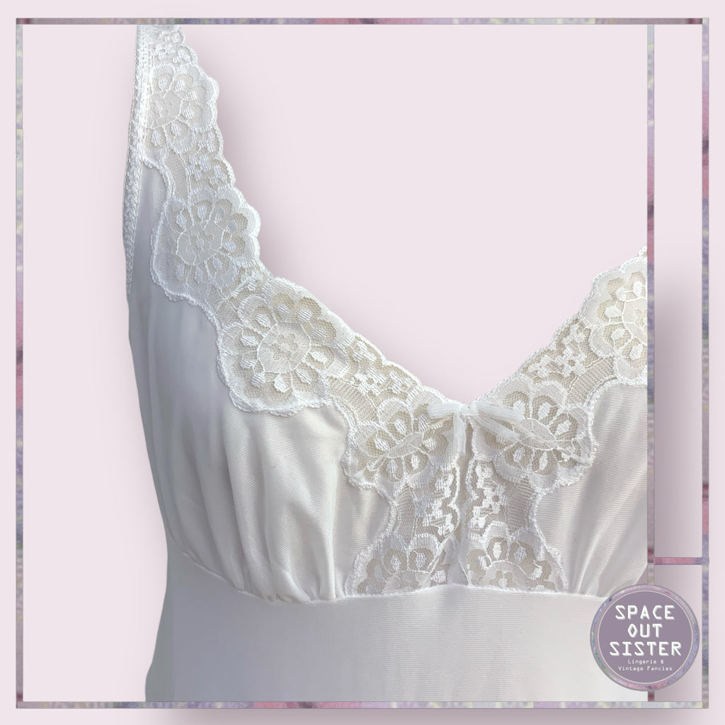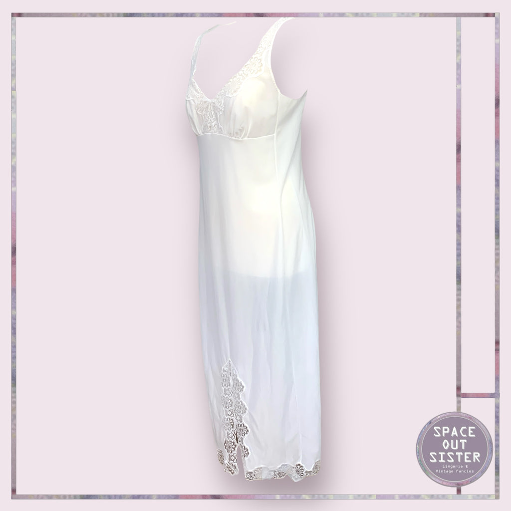 This vintage white full length nightdress boasts a flattering V neckline and side split for a touch of elegance. Versatile enough to be worn as a slip, add this gorgeous piece to your collection for a classic and timeless look.