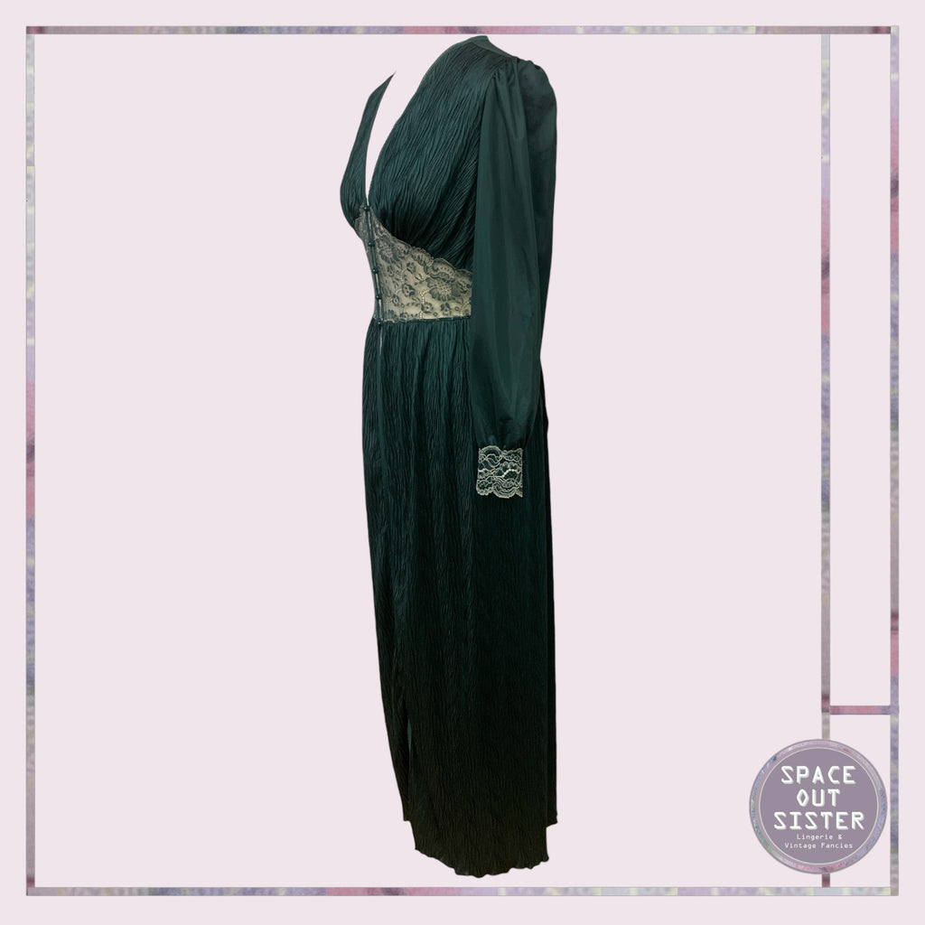 Indulge in luxury and elegance with the Vintage Charnos Robe. Crafted in a beautiful forest green color, this robe features delicate lace inserts and button fastenings for a stunning bodice. A timeless statement piece for any wardrobe.
