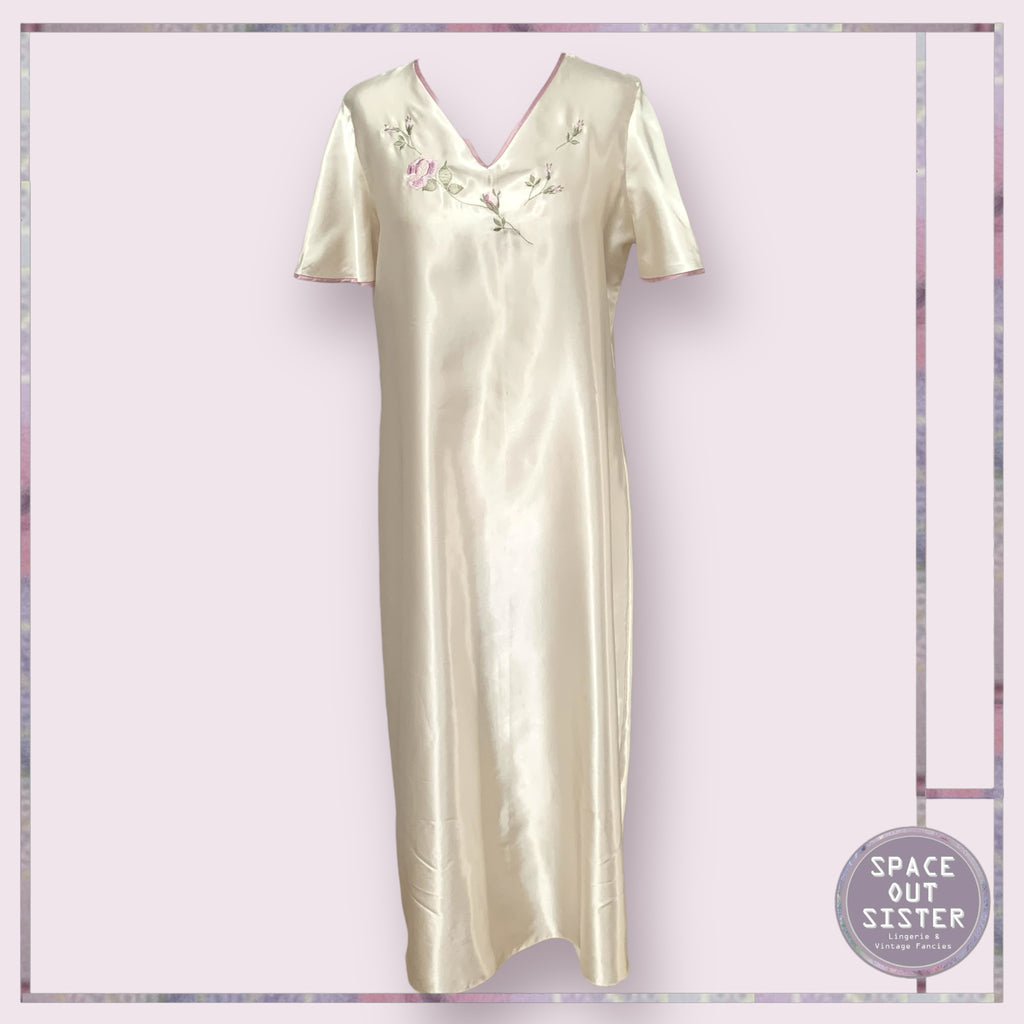 Enjoy a comfortable and elegant night's sleep with our vintage satin nightdress from M&S. The loose fit and delicate ivory color provide a classic and timeless look, while the beautiful mauve floral embroidery adds a touch of femininity. Made with high-quality materials, this nightdress is perfect for indulging in luxurious sleep.